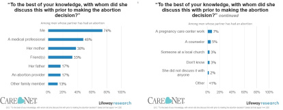 A la pregunta ¿Con quién discutió esto antes de tomar la decisión?, un 74% de los hombres consultados respondieron "conmigo", quedando los profesionales sanitarios o las madres en unos lejanos 48 y 38%, respectivamente. Después de que sus parejas se sometiesen al aborto, el 38% de los consultados admitió haber sido la mayor influencia en la decisión.